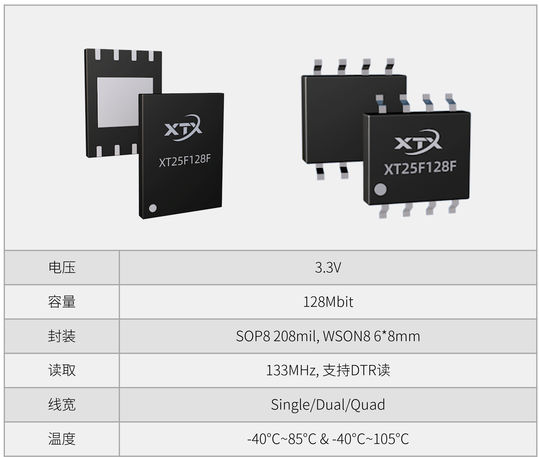 重磅来袭!芯天下高性能 3.3v 128mb spi nor flash xt25f128f系列采用55nm etox工艺,新产品读写速度更快,产品功耗更小。